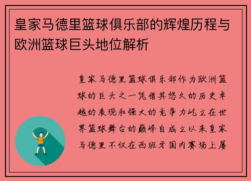 皇家马德里篮球俱乐部的辉煌历程与欧洲篮球巨头地位解析